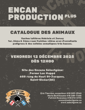 L'Encan Production PLUS propose environ 65 vaches laitières en consignation, principalement des primipares, secondes et troisièmes lactations, ayant vêlé il y a moins de 60 jours. Ces animaux présentent d'excellents pedigrees, de bons pis, des pieds et membres solides, ainsi que des comptes de cellules somatiques (CCS) très faibles.