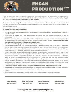 L'Encan Production PLUS propose environ 65 vaches laitières en consignation, principalement des primipares, secondes et troisièmes lactations, ayant vêlé il y a moins de 60 jours. Ces animaux présentent d'excellents pedigrees, de bons pis, des pieds et membres solides, ainsi que des comptes de cellules somatiques (CCS) très faibles.